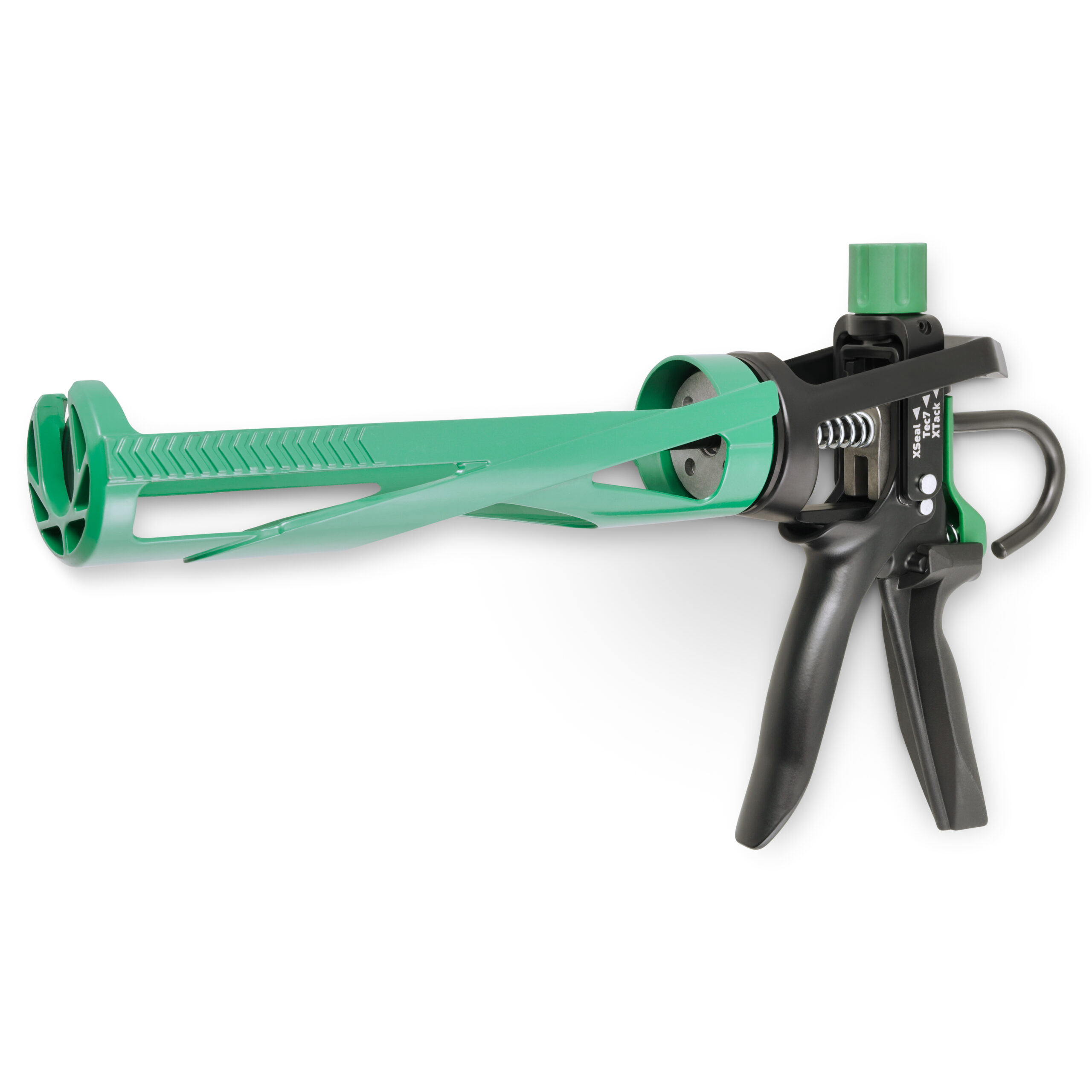 The full-power control gun features an adjustable thrust ratio and is suitable as one gun for all sealants and adhesives. It includes an ergonomic handle and a lightweight, rotatable aluminum frame.
