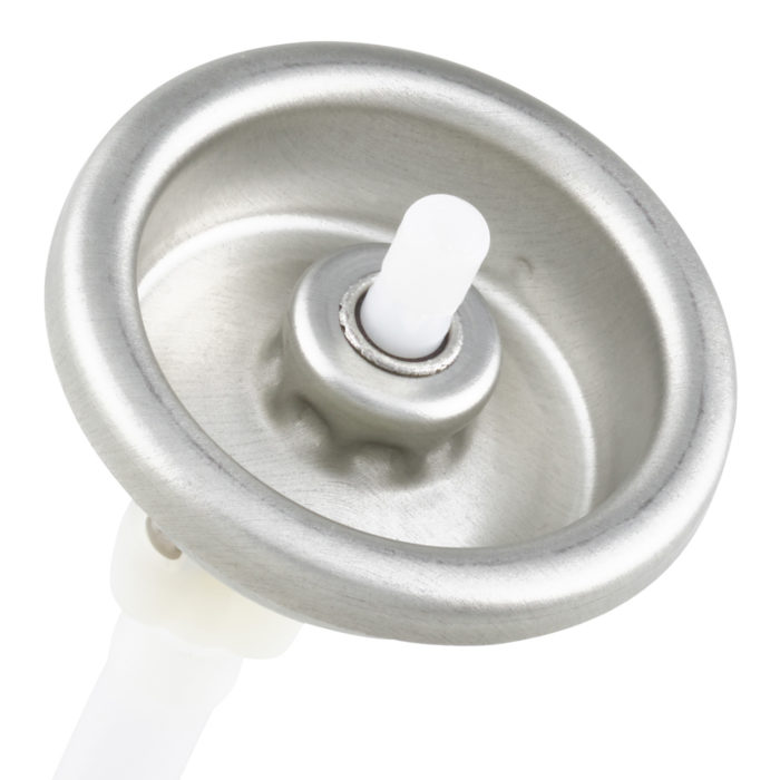 One-inch ball valve with continuous 180° (up-down) actuation, allowing use in any orientation. 4 mm stem. Supplied with tinplate or aluminum mounting cup. Suitable for tinplate or aluminum aerosol cans. Also available with long-skirt mounting cup for use with PET containers. It is recommended for compressed gas propelled aerosols and inverted applications.